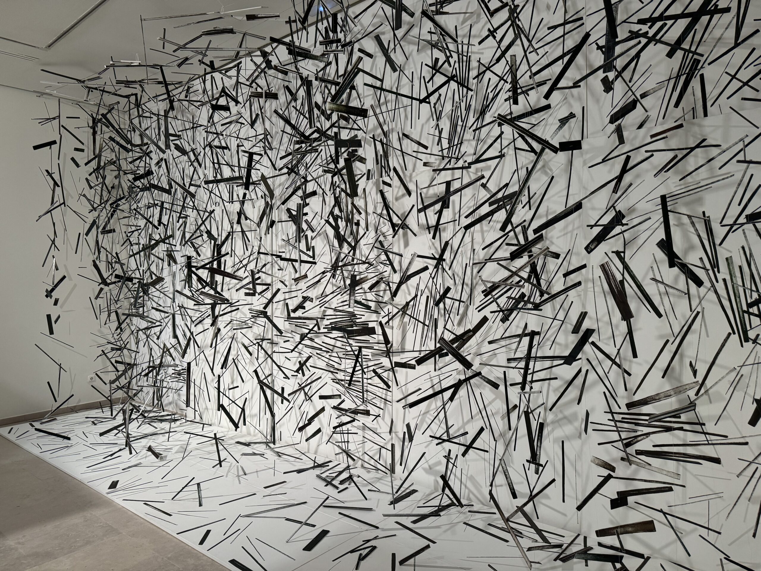 Por último, al fondo de este espacio, de la sala 4, nos encontramos con otra de sus impresionantes obras, Supercuerdas. Una contundente instalación construida con una amplia serie de pinturas al óleo sobre tela de gran formato, sobre el muro y, delante, numerosos móviles de piezas pictóricas sobre madera, suspendidos en el aire, dando la sensación de estar flotando, y con los que crea ritmos compositivos en el espacio.