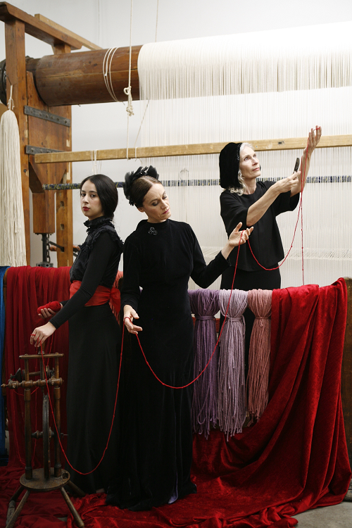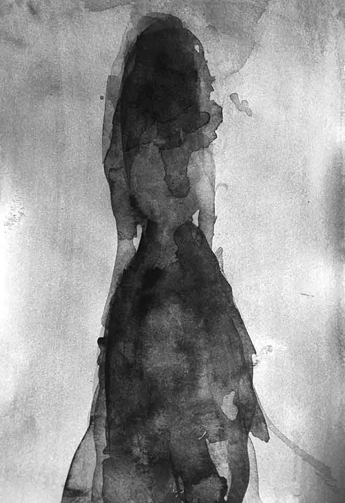 Sombras de aspecto goyesco en dibujos como Custodia (figura desapareciendo), 2023, que nos dan la espalda y se van, se alejan tras un velo, ascendiendo a otro espacio tiempo. Al igual que personifican la creación, abordan la idea de la desaparición. En la mitología griega son las Moiras, 2025, hijas de la noche y personificaciones del destino. Representadas como un gran cuadro de historia, aparecen junto al telar y la lana que vira del rojo al malva.